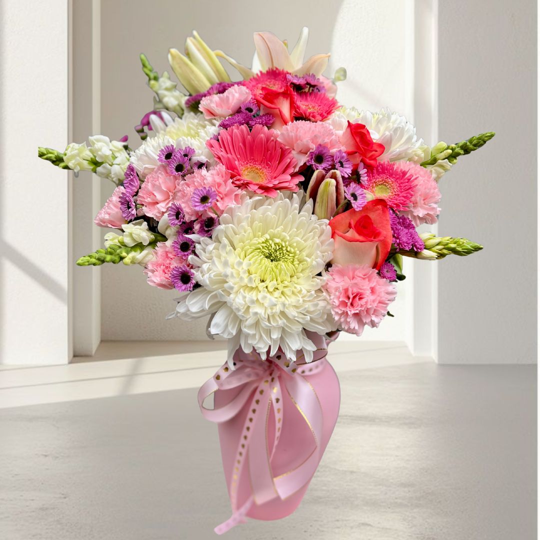 - Carnations, pompoms, gerberas, star of Bethlehem and mini pompoms.