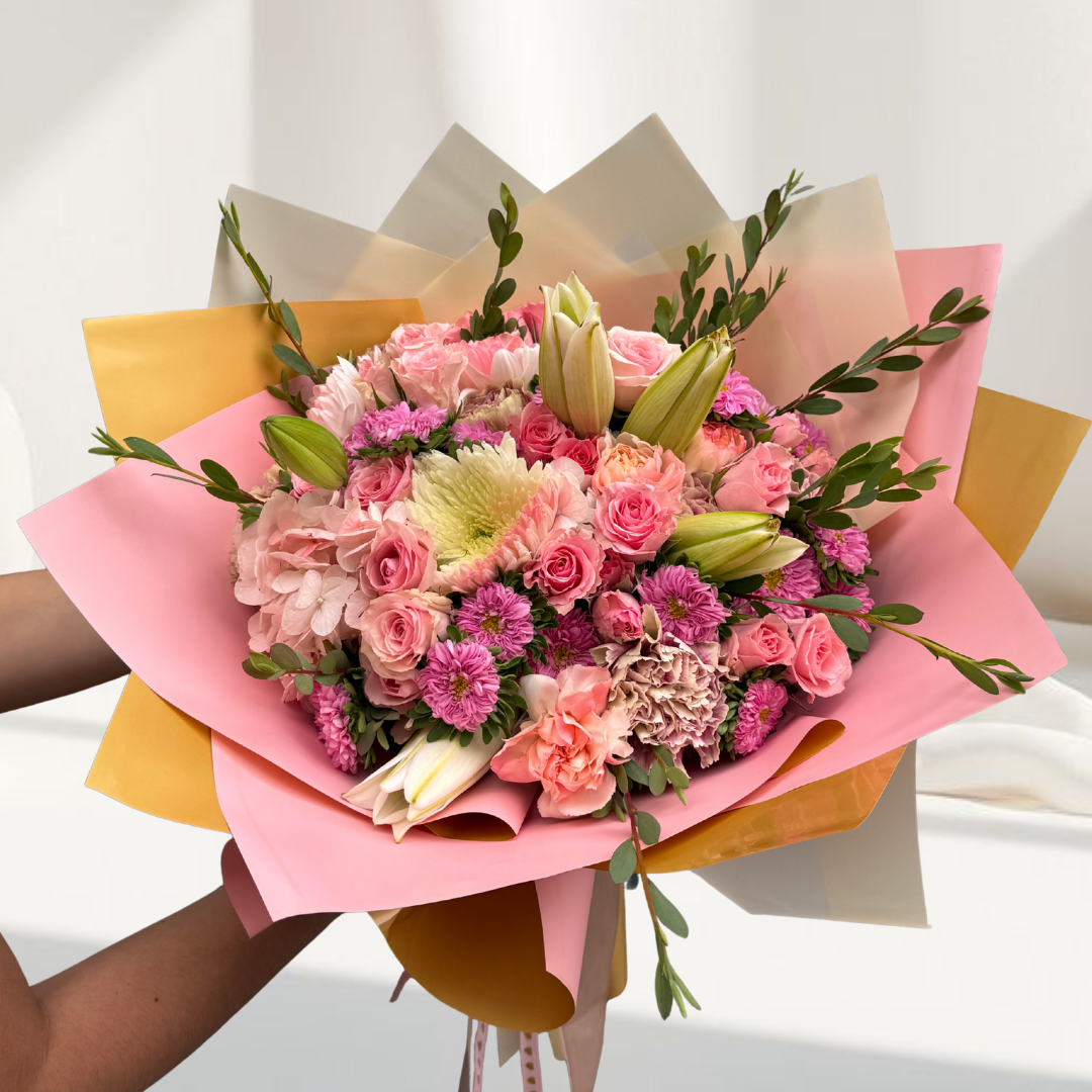 - Arreglo en tonos pasteles, incluye rosas, lirios, fully o cremones, claveles, clavellinas, hortensias y follajes hermosos.
