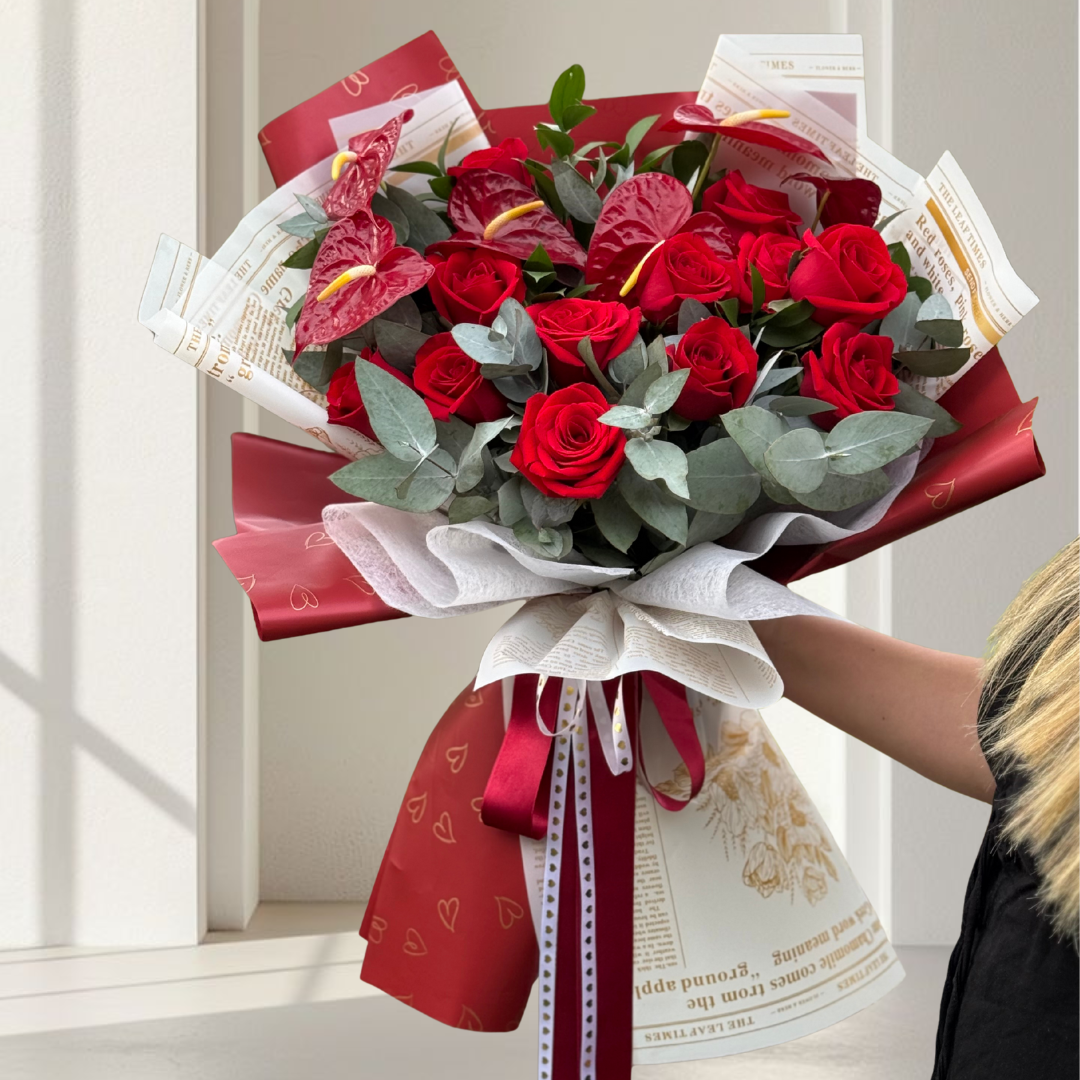 - Elegante ramillete con 12 rosas, anturios, eucalipto y follaje verde.